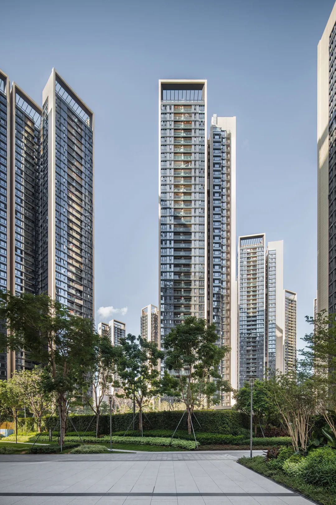 住宅地块关注高密度下的近人尺度空间的感受,从城市街道公共开放空间的节点设计到社区入口、大堂门厅、回家玄关的空间序列,都体现细致匠心的设计精神。住宅产品是深圳装配式项目范例,产品设计体现建筑室内一体化,建造标准化,工业化施工的先进理念。