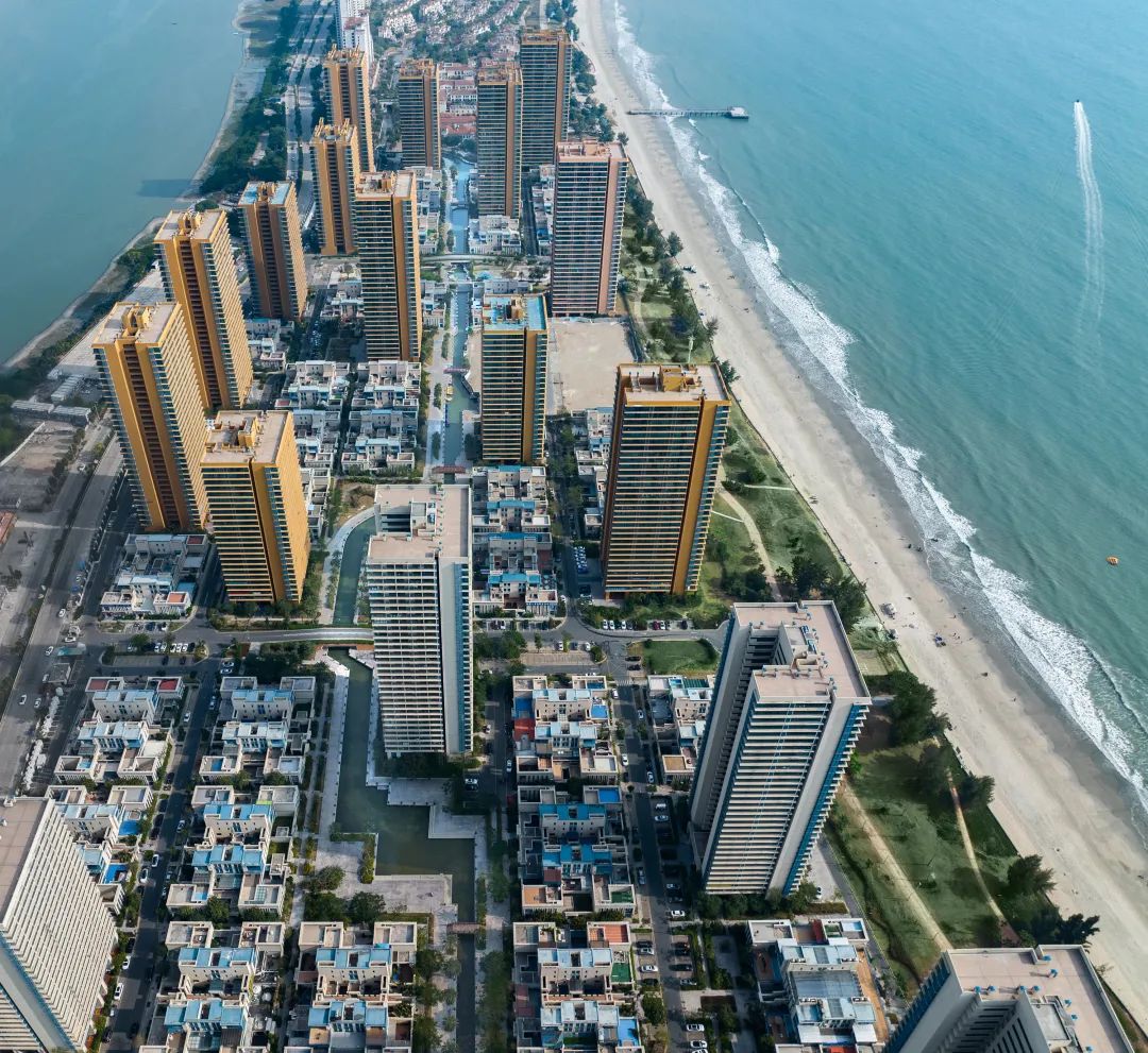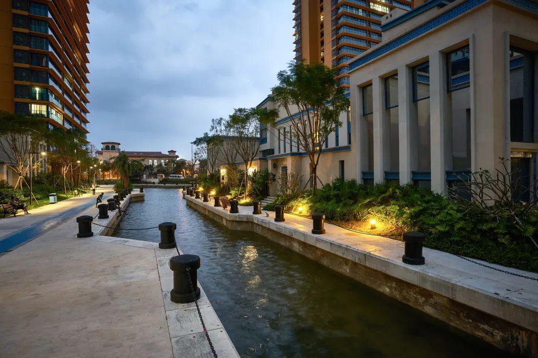 在这些街道划分出来的网格中,建筑被有机地插入其中,间距尽量拉开,保证高层的塔楼的观海视野,放置在这些“格”内,而在高层之下的其他格的用地空间里错动地插入多层,来组合小区的空间界面。这使得整个社区空间形态形成了高低错落宛若后现代卷轴的画面;方形的塔楼契合独特的海景资源,三面朝向大海,提高了海景资源的利用率。通过运河水道串联,使整体规划结构更加丰富而生动,同时增强浪漫而休闲的度假风情。