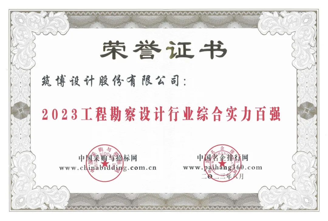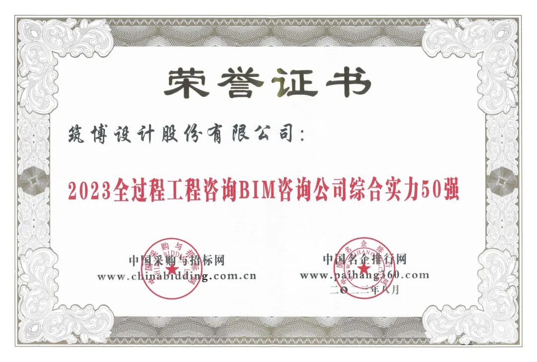 经过严格的数据核对和综合评选,筑博设计入选“2023工程勘察设计行业综合实力百强”、“2023全过程工程咨询BIM咨询公司综合实力50强”。