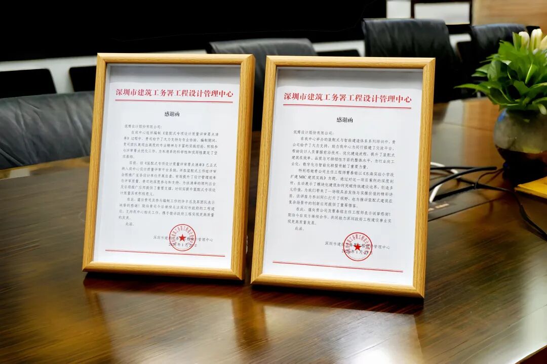 近日,深圳市建筑工务署工程设计管理中心 向筑博设计股份有限公司致送感谢信,对筑博设计在 装配式专项设计质量评审要点清单编制、装配式与智能建造体系系列培训 等工作中的专业支持与突出贡献,致以诚挚感谢。