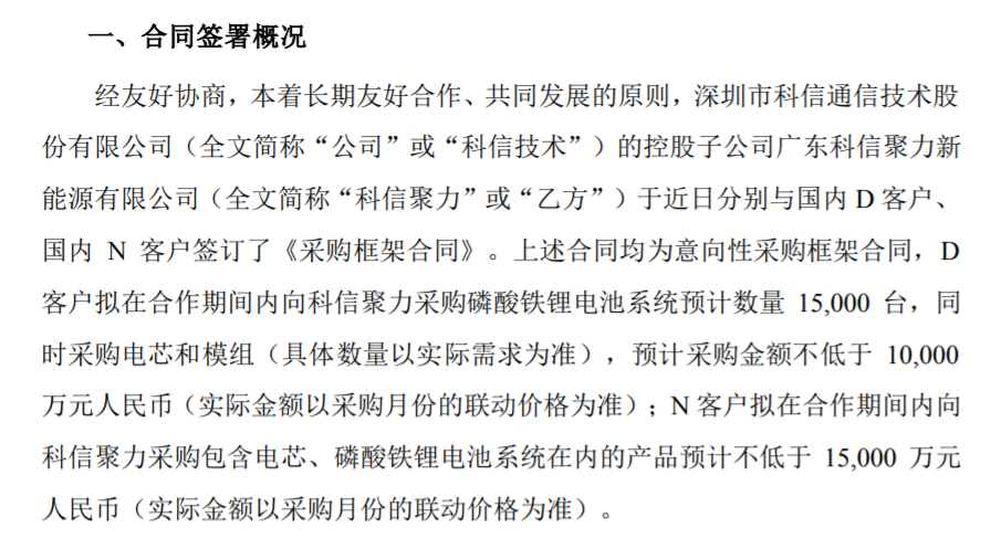 3月8日,科信技术(300565.SZ)公布,公司控股子公司广东科信聚力新能源有限公司(“科信聚力”或“乙方”)于近日分别与国内D客户、国内N客户签订了《采购框架合同》。上述合同均为意向性采购框架合同,D客户拟在合作期间内向科信聚力采购磷酸铁锂电池系统预计数量15000台,同时采购电芯和模组(具体数量以实际需求为准),预计采购金额不低于1亿元人民币(实际金额以采购月份的联动价格为准);N客户拟在合作期间内向科信聚力采购包含电芯、磷酸铁锂电池系统在内的产品预计不低于1.5亿元人民币(实际金额以采购月份的联动价格为准)。