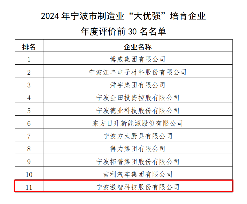 近日,宁波市经济和信息化局公布了2024年宁波市制造业“大优强”培育企业年度评价前30名名单,激智科技位列第11名。全市共有营业收入千亿级、百亿级等培育企业104家参与考核,激智科技在总排名中位列前茅,彰显了激智科技的强大竞争力,是对企业蓬勃发展的大力表彰,为企业未来发展注入强大的信心和动力。