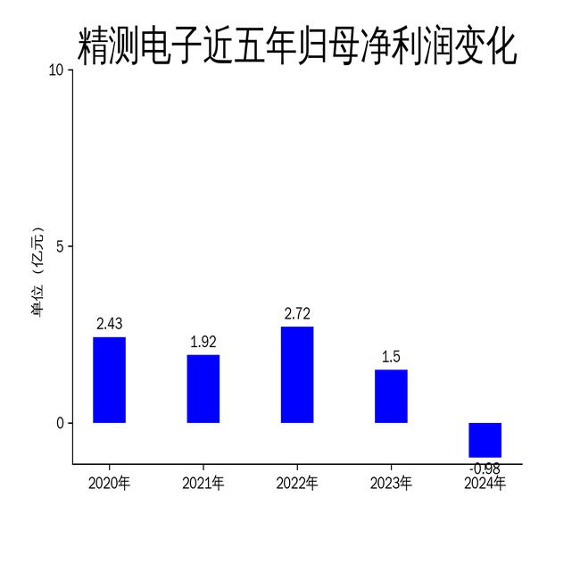 2025年5月6日,精测电子发布了2024年年报。报告显示,公司实现营业总收入25.65亿元,同比增长5.59%;毛利润为10.25亿元,同比减少10.40%;归属净利润为-0.98亿元,同比下降165.02%;扣非净利润为-1.59亿元,同比下降582.26%。尽管营收有所增长,但净利润和扣非净利润均出现大幅下滑,显示出公司在盈利能力方面面临严峻挑战。