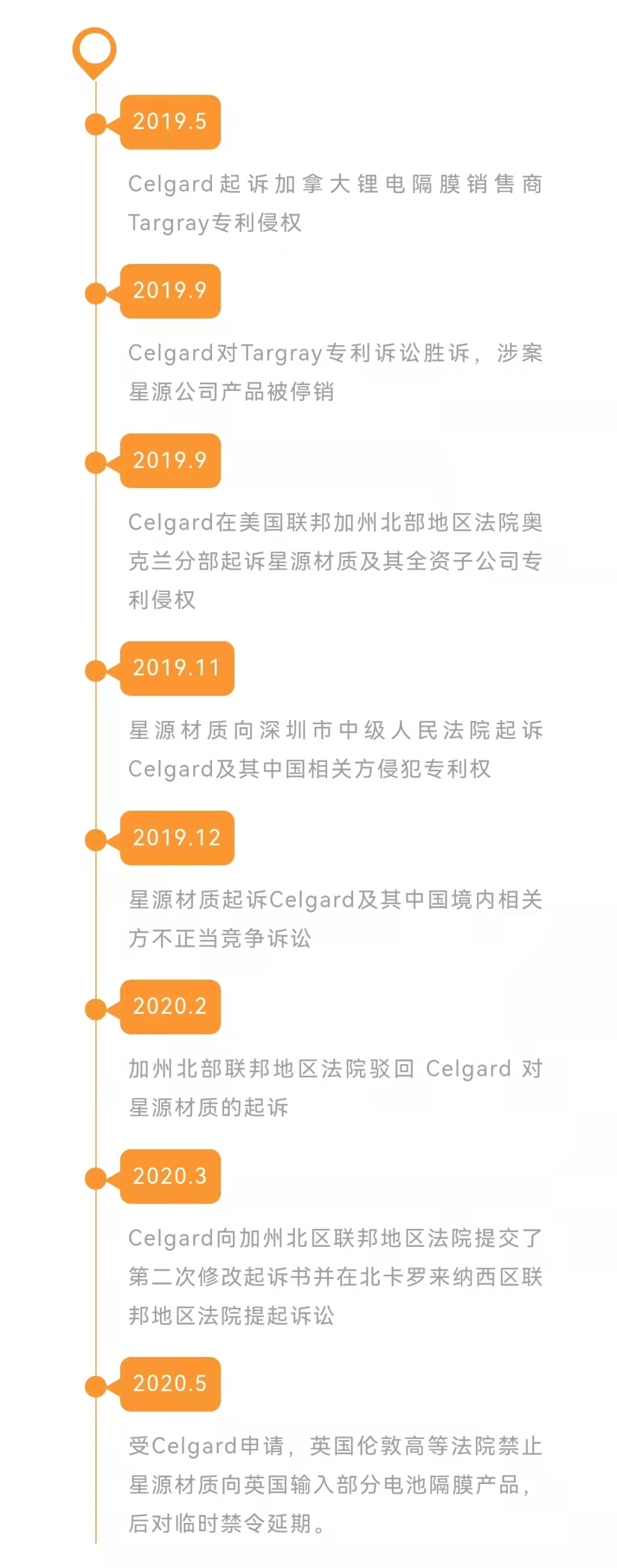 2013年,Celgard在美国先后起诉了日本住友化学和韩国SKI,2014年继续起诉LG化学,2018年起诉美国MTI,2019年将加拿大的Targray和星源材质、孚能科技送上了美国法庭。