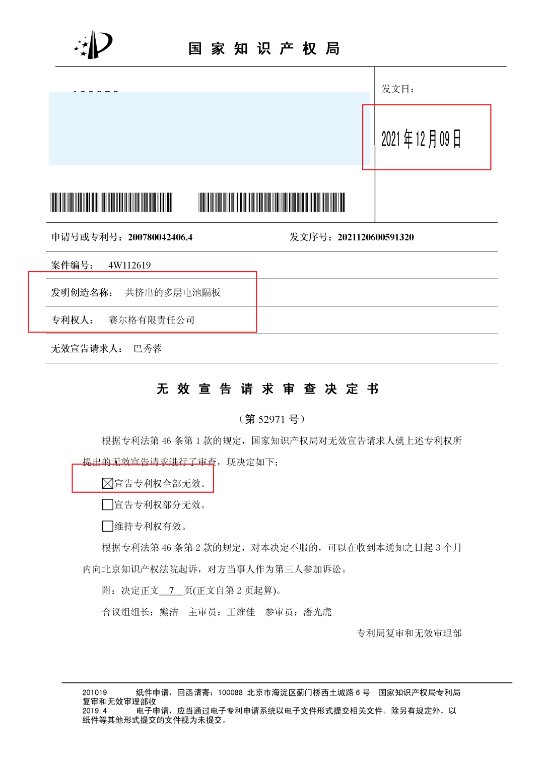 12月9日,国家知识产权局公告显示,美国Celgard公司(赛尔格有限责任公司)的ZL200780042406.4号发明专利,名称为“共挤出的多层电池隔板”被宣告全部无效,无效请求人有两位:一个是深圳市质量强市促进会副会长单位——深圳市星源材质科技股份有限公司,一个是自然人“巴秀荣”。