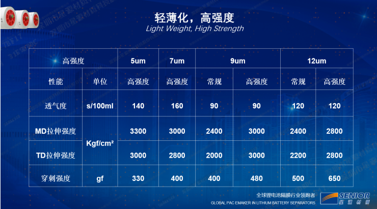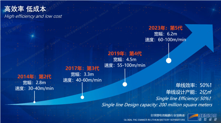 湿法隔膜,目前数码产品基本上是在5um、7um的厚度,动力电池和储能电池基本上是7um,9um、11um的厚度范围,除了厚度以外还有其他维度,包括高强度,高模量、高孔隙率、低阻抗和低闭孔温度等性能指标,我们都有不同的系列产品来对应不同的应用需求。现在很多客户开发快充、超充的动力电池产品,高孔隙率,低阻抗、高电解液浸润性的产品会比较有优势。除了产品性能以外,为了应对未来市场的竞争和需求,我们在产品装备升级上也是不断进取,最新的是明年年中在江苏南通的第五代湿法线,6.2米宽幅产线,单线年产能可以达成2亿平方,效率比上一代产线提升50%。近期,一些电池厂提出了未来锂电池材料领域产能过剩的风险,我们觉得优质产能是不会过剩的,过剩的会是那些低效的、高能耗的产能。