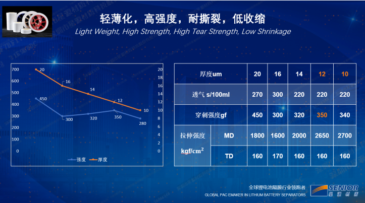 锂离子电池在消费数码,新能源汽车、储能电站的广泛应用,其电池安全性和能量密度是绕不开的行业痛点,基于此,就锂电池隔膜材料的功能特点和产业应用趋势,我们在产品上一直坚持高安全,轻量化,低成本,长寿命的开发方向。对于干法基膜主要是突出薄型化,高性能、低成本的特点,主要应用于储能电池,动力电池等领域。干法隔膜经过多年的发展,在制程装备、产品规格和性能、产品一致性、应用领域等方面都有极大的提升和拓展。我司在2020年率先将最新一代的宽幅14um干法复合隔膜量产应用于动力电池领域,此后,随着客户要求的不断提升和行业发展的趋势,我们又相继开发出了12um、10um的量产产品,目前在稳步推进量产中。湿法隔膜除了产品厚度和差异化的性能以外,目前主要围绕单位厚度的高强度和单线产能最大化的方向发展,因为行业的发展要求材料低成本化,而公司的发展,要求产品利润最大化并保持持续的行业竞争力,所以,大规模制造,稳定的产品性能、单线产能提升和综合成本的降低是未来锂电池隔膜行业发展的趋势。