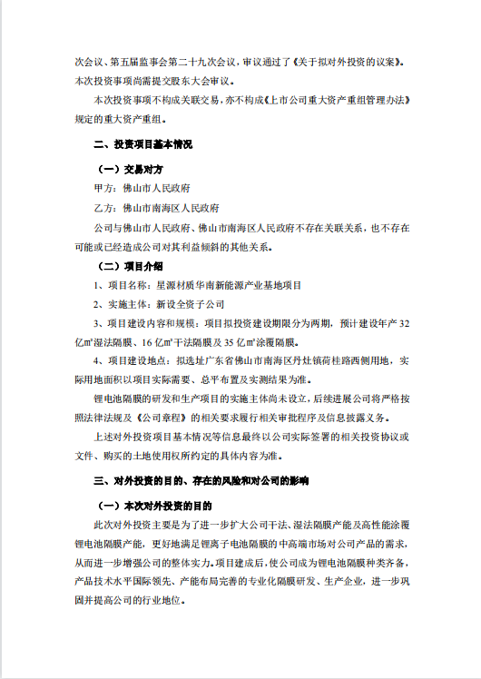 二是在江苏南通投资建设的高性能锂电池湿法隔膜及涂覆隔膜项目,拟投资总额100亿元。项目建成后将新增30亿平方米湿法隔膜和涂覆隔膜产能。