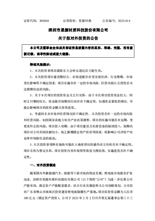 2月2日,星源材质发布公告称,公司拟在广东省佛山市南海区投资建设锂电池隔膜生产基地。项目拟投资总额为100亿元(固定资产投资),拟分为两期建设年产32亿㎡湿法隔膜、16亿㎡干法隔膜及35亿㎡涂覆隔膜。