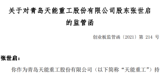 昨日,深交所向青岛天能重工股份有限公司(简称“天能重工”,300569.SZ)股东张世启下发监管函。
