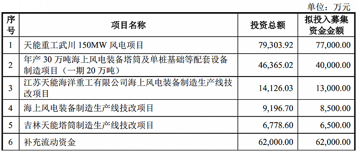 根据2022年3月18日发布的最新定增方案,该公司该轮定增仍针对风电项目。其中,7.7亿元将用于投资武川150MW风电项目;6.8亿元将投资风电装备制造项目,分别涉及年产30万吨海上风电装备塔筒及单桩基础等配套设备制造项目(一期20万吨)、江苏天能海上风电装备制造生产线技改项目、海上风电装备制造生产线技改项目、吉林天能塔筒制造生产线技改项目;另外6.2亿元用于补充流动资金。