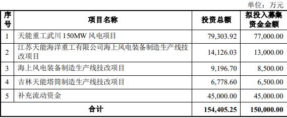 本次向特定对象发行募集资金总额不超过15.00亿元,扣除发行费用后拟将全部用于天能重工武川150MW风电项目、江苏天能海洋重工有限公司海上风电装备制造生产线技改项目、海上风电装备制造生产线技改项目、吉林天能塔筒制造生产线技改项目、补充流动资金。