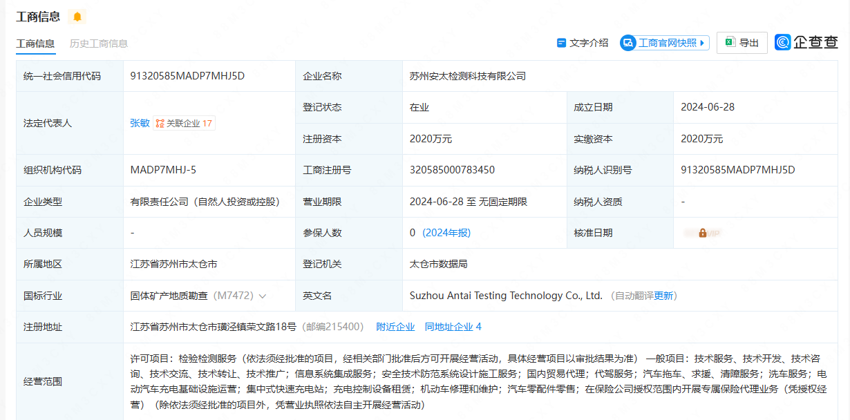 投资者口中的“苏州安太集团”可能为苏州安太检测科技有限公司。企查查数据显示,该公司成立于2024年6月28日,注册资本为2020万元,主营业务也包括检测检验服务。安车检测此次的控制权变更是否与之相关?