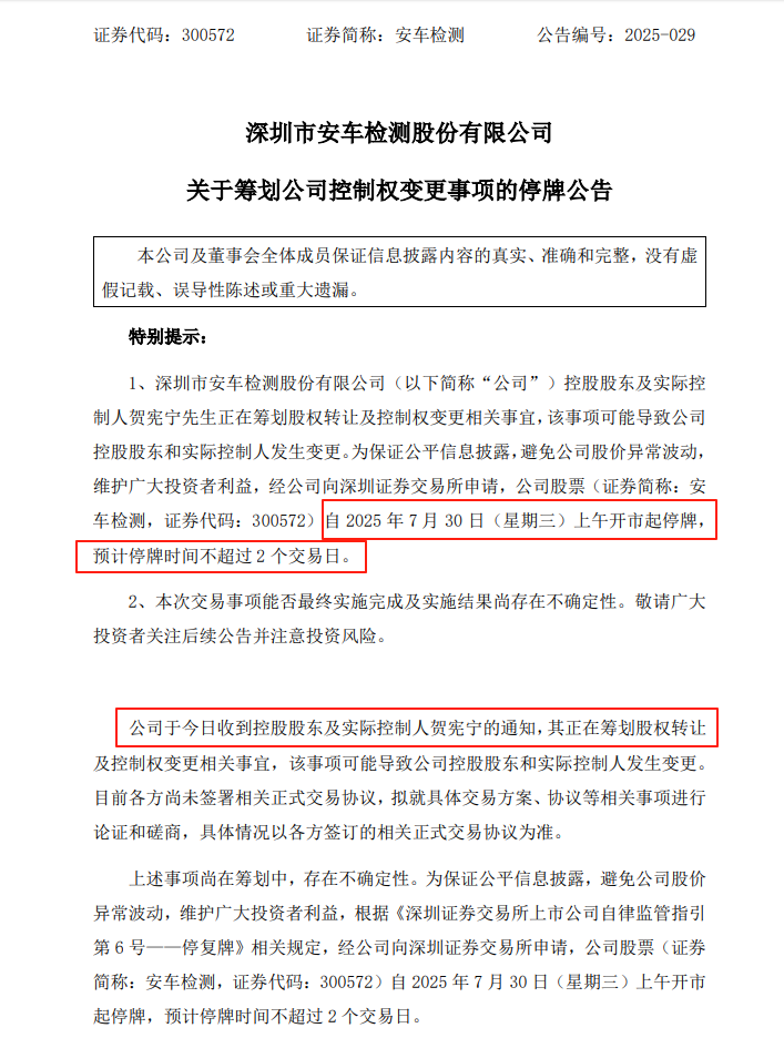 7月29日晚间,安车检测(300572)发布了控股股东及实际控制人贺宪宁先生正在筹划股权转让及控制权变更相关事宜的公告。