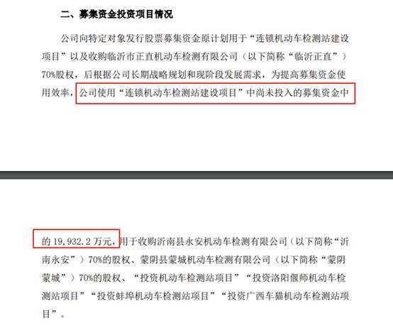 在4月24日的公告中,公司宣布,其原计划用于“连锁机动车检测站建设项目”中尚未投入的募集资金中的19,932.2万元,将用于收购沂南县永安机动车检测有限公司70%的股权及其他项目。安车检测称,该举措在一定程度上可以避免造成募集资金浪费,后续将根据市场情况以及自身实际状况决定是否继续实施“连锁机动车检测站建设项目”。