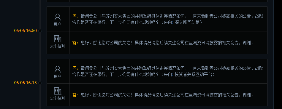 记者还注意到,6月6日,有投资者在互动平台上询问公司与“苏州安太集团”的并购重组进展,但安车检测一直无相关公告披露。