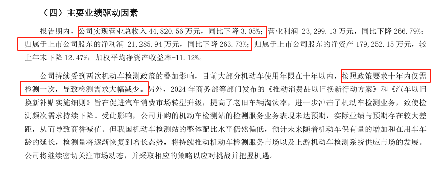 然而,作为国内机动车检测行业、机动车驾驶人考试行业整体解决方案提供者,安车检测近年来业绩低迷,已连续三年处于亏损状态。同花顺数据显示,安车检测2022年至2024年分别亏损3140.55万元、5852.20万元和2.13亿元,亏损规模逐年扩大。2025年一季度,安车检测营收为1.15亿元,同比减少8.23%;归母净利润亏损0.04亿元。