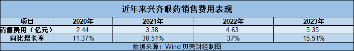 2023年,兴齐眼药的销售费用为5.35亿元,同比增加15.51%。值得关注的是,2020年以来,兴齐眼药的销售费用连年增加。