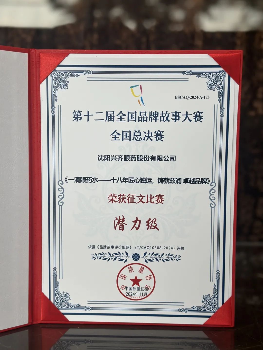 兴齐眼药深度聚焦品牌建设,紧紧围绕“经营健康缔造光明”的企业使命、“执着创新责任共赢”的价值观等文化理念。通过深入调研、采访沟通等方式收集素材,创作选送了内容鲜活、感染力强的品牌故事作品《一滴眼药水——十八年匠心独运,铸就兹润?卓越品牌》,并荣获第十二届全国品牌故事大赛全国总决赛征文比赛潜力级奖项!