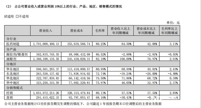 滴眼剂产品2024年的营业收入为13.66亿元,占营业收入比重的70.3%。报告还进一步显示,滴眼剂的板块毛利率为82.18%,营业收入较上年同期增加106.08%。