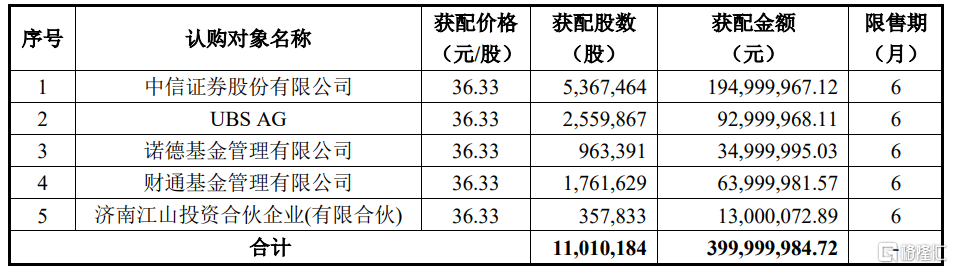 7月4日容大感光(300576.SZ)公布2022年度向特定对象发行股票发行情况报告书,确定本次发行价格36.33元/股,发行股数1101.0184万股,募集资金总额约4.0亿元。本次发行对象最终确定5名。本次发行配售结果如下: