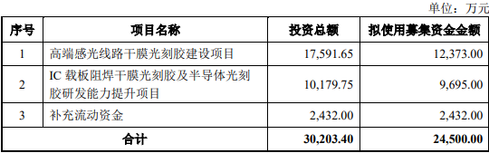 根据预案,容大感光本次发行扣除相关发行费用后的募集资金净额将全部用于高端感光线路干膜光刻胶建设项目、IC载板阻焊干膜光刻胶及半导体光刻胶研发能力提升项目和补充流动资金。