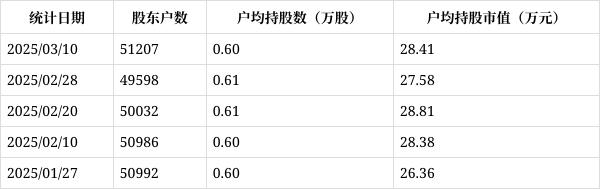 从3月11日公开信息显示,容大感光截至2025年3月10日公司股东户数为5.12万户,较上期(2025年2月28日)增加1609户,增幅为3.24%,变化不大。