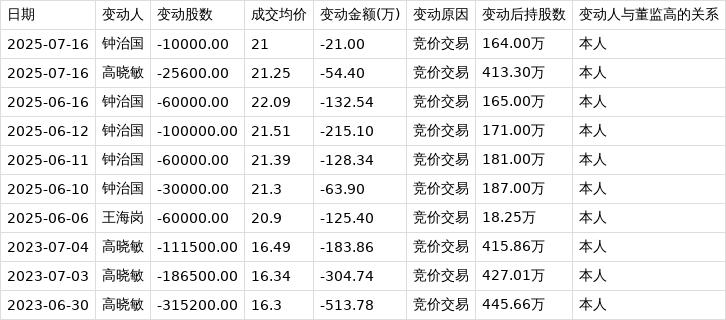 深交所公开信息显示,7月16日,开润股份董事、高管钟治国在竞价交易公司股票,减持股数1.00万股,成交均价21.00元,变动金额21.00万元,变动后持股数为164.00万股。