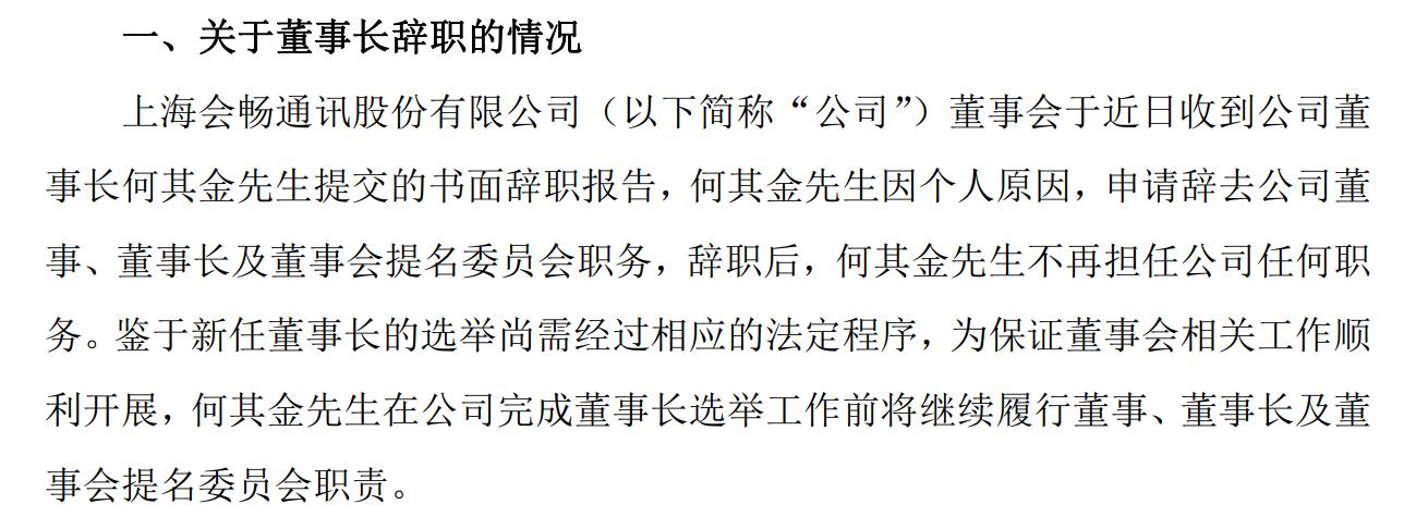 10月23日,何其金因个人原因辞去会畅通讯董事、董事长等职务,辞职后不再担任会畅通讯任何职务。会畅通讯已提名何飞为第五届董事会非独立董事候选人,待股东大会审议通过后,将进行新任董事长的选举。