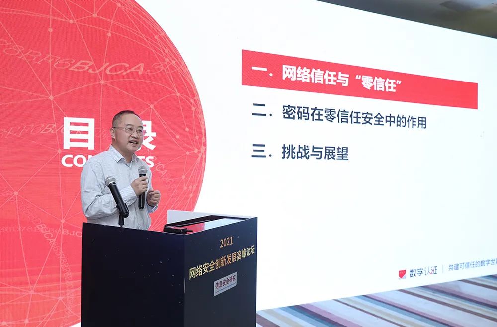 在大会零信任分论坛,北京数字认证股份有限公司董事长詹榜华也受邀出席,并发表了“零信任与密码”的主题演讲。中国科学院大学密码学院院长荆继武、中国信息安全研究院副院长左晓栋、国家信息技术安全研究中心总师郭晓雷也出席该论坛并发言。