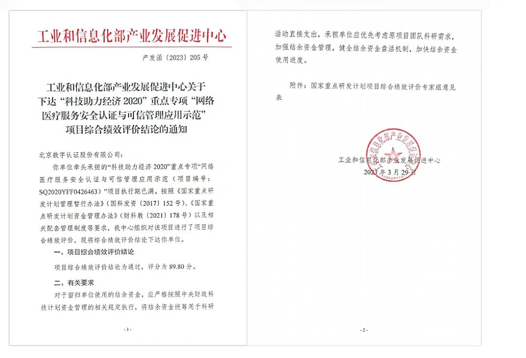 近日,北京数字认证股份有限公司(以下简称“数字认证”)牵头承担的国家重点研发计划“科技助力经济2020”重点专项项目——“网络医疗服务安全认证与可信管理应用示范”顺利通过项目主管部门工业和信息化产业发展促进中心的正式验收。