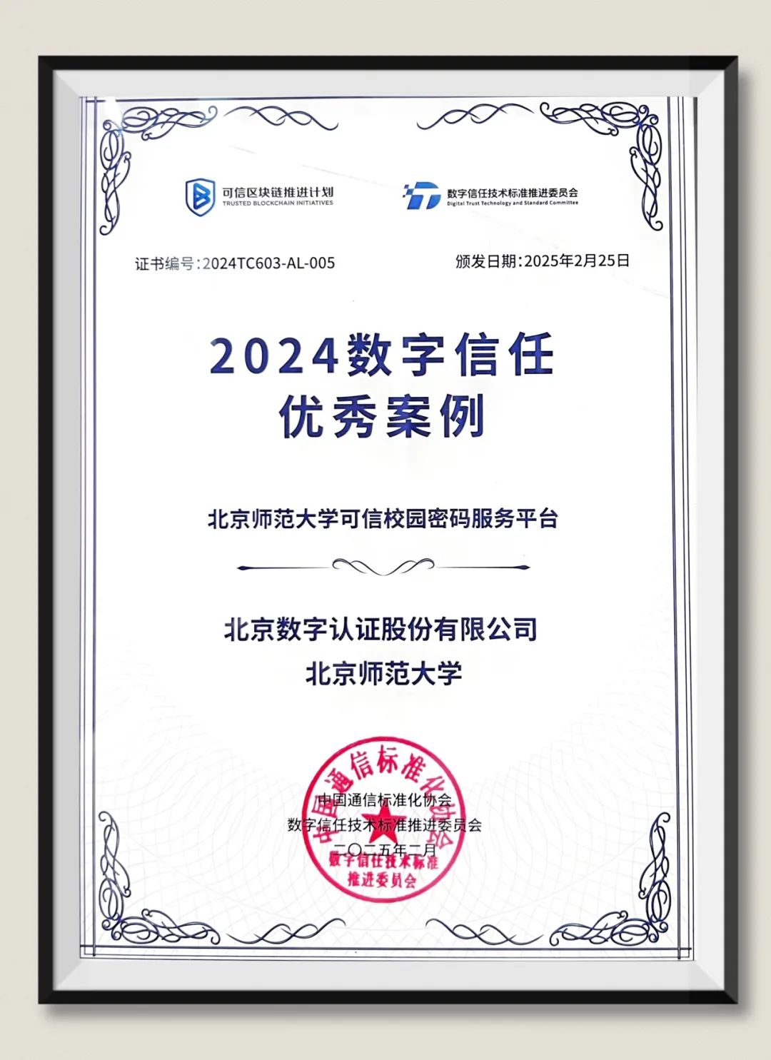 2月25日,由中国互联网协会、香港Web3.0 协会联合主办的2024 Web3.0创新大赛颁奖典礼在上海正式举行。主办方邀请业内产学研专家,共同为大赛优胜团队颁奖,并围绕Web3.0、数字身份、数字信任等关键议题,发布重磅研究成果。北京师范大学和北京数字认证股份有限公司联合申报的“北京师范大学可信校园密码服务平台”经过初审、专家评审等过程,最终成功入选中国通信标准化协会数字信任技术标准推进委员会“2024数字信任优秀案例”,北京师范大学也是本次征集活动中唯一入选的高校。