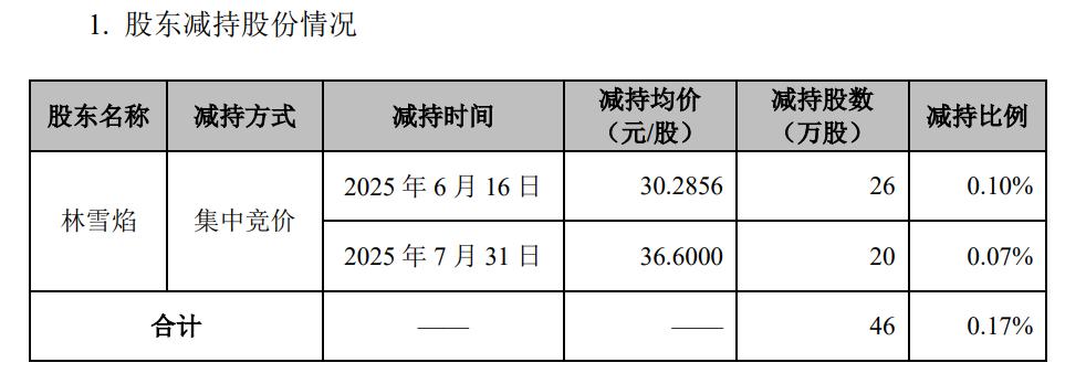 值得注意的是,林雪焰在三季报披露前已完成减持计划。据数字认证8月4日发布的公告显示,林雪焰在2025年6月至7月期间,通过集中竞价方式累计减持46万股,减持均价分别为30.29元/股和36.60元/股。
