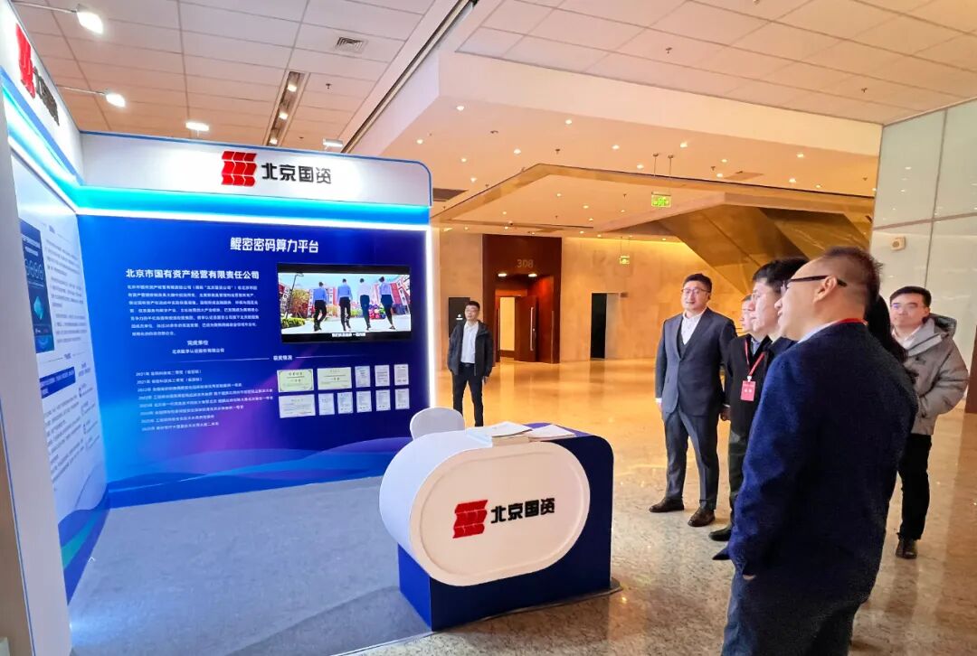 北京市政府副秘书长舒毕磊,北京市国资委党委书记、主任吴礼顺一行参观至 北京国资 公司展台前, 北京国资 公司党委副书记、总经理郭永昊介绍了国资公司“十四五”创新成果, 数字认证 董事长林雪焰介绍了“鲲密密码算力平台”在金融、政务、医疗等关键领域的应用情况。