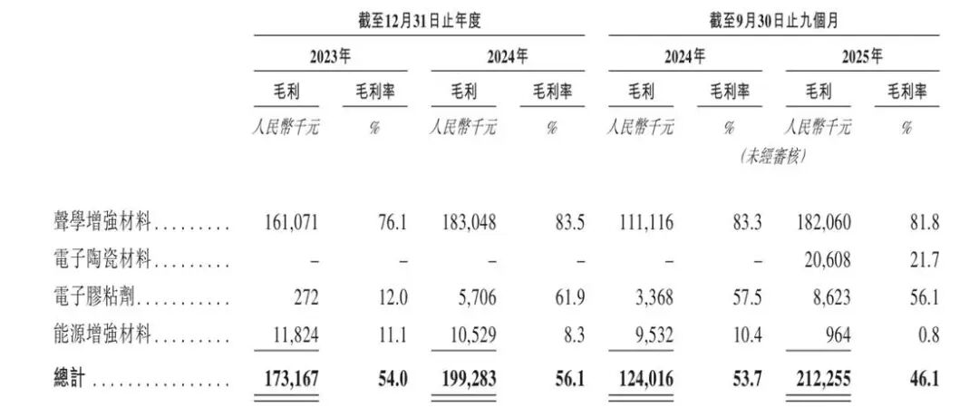 分产品看,贝斯特新材料核心产品声学增强材料的毛利率水平较高,2023年及2024年分别为76.1%及83.5%,2025年前9个月为81.8%,同比下滑1.5个百分点。