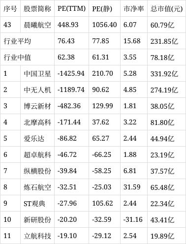 从行业市盈率排名来看,公司所处的航天航空行业市盈率平均76.43倍,行业中值62.38倍,晨曦航空排名第43位。