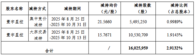 2025年8月25日至2025年10月31日期间,寰宇星控通过集中竞价方式累计减持公司股票549.5250万股,通过大宗交易方式累计减持公司股票1,053.0709万股,累计减持股数达到公司总股本的2.9132%。