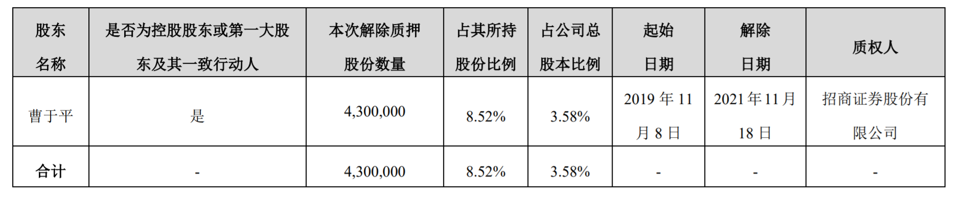 公告显示,海辰药业控股股东、实际控制人之一、董事长曹于平将所持海辰药业430万股股份办理了解除质押手续,占海辰药业总股本比例为3.58%。