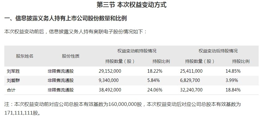 据奥联电子12月7日披露的简式权益变动报告书,刘军胜、刘爱群为兄妹关系,刘爱群系刘军胜的一致行动人。刘军胜、刘爱群本次权益变动后分别持有奥联电子2541.1万股和682.97万股股份。