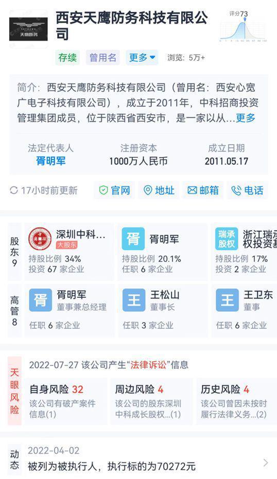 信息显示,胥明军至少从2015年6月29日至今,一直担任西安天鹰防务科技的法人代表,目前持股20.1%。