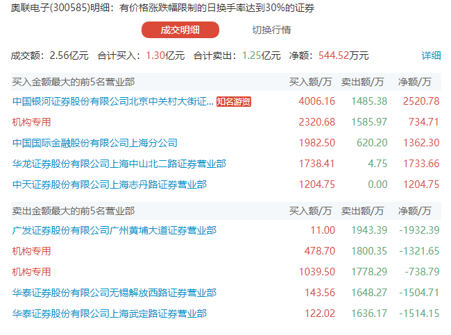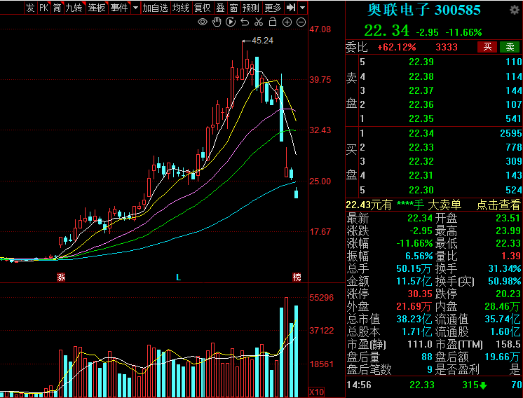 2月24日,奥联电子跌11.66%,成交额11.57亿元,换手率31.34%,盘后龙虎榜数据显示,2家机构净卖出2060.44万元。2月21日至2月24日期间,奥联电子股价跌幅达41.56%。