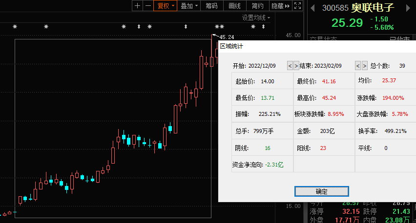 蹭上“钙钛矿”概念热度之后,奥联电子一跃成为“明星股”,股价从公告当天的13.94元/股起步一路狂飙,涨至2023年2月9日的45.24元/股,涨幅高达225%。