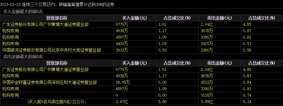 有意思的是,据2月23日盘后龙虎榜数据显示,卖1广发证券广州黄埔大道营业部净卖出1.36亿元,此前的2月21日该营业部同样净卖出约1亿元,或可认为前期介入的主力资金正急切出逃。而买2至买4为机构通道,分别净买入1000万至2000万元不等,意欲何为令人捉摸不透。