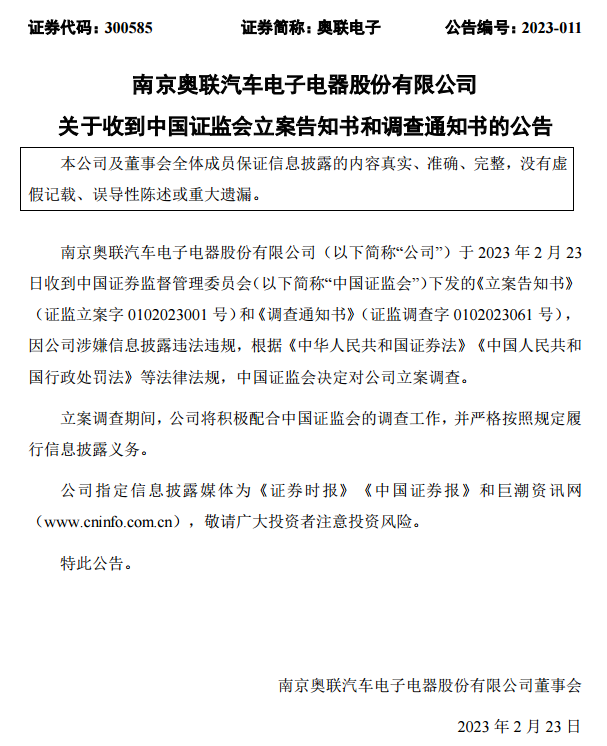 2月23日,奥联电子收到中国证监会下发的《立案告知书》,中国证监会决定对公司立案调查。