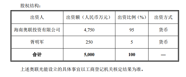 在2022年12月发布的公告中,奥联电子称全资子公司海南奥联投资有限公司(以下简称“奥联投资”)将与自然人胥明军共同设立“南京奥联光能科技有限公司”,这家公司主要从事钙钛矿太阳能电池及其制备装备的研发、生产、销售等。其中,胥明军以货币方式出资250万元,占比5%。
