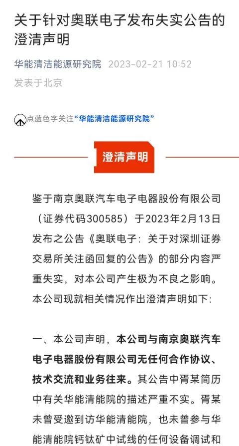 事件起于2月21日,华能清能院在官微发布澄清声明称,公司与南京奥联汽车电子电器股份有限公司无任何合作协议、技术交流和业务往来。其公告中,胥某简历中有关华能清能院的描述严重不实,胥某不存在“指导华能清能院 550×650mm 钙钛矿电池组件中试线效率验收达标,最高认证效率达到16.8%”等相关事实。当天奥联电子股价直线跳水,当日下跌20.01%。
