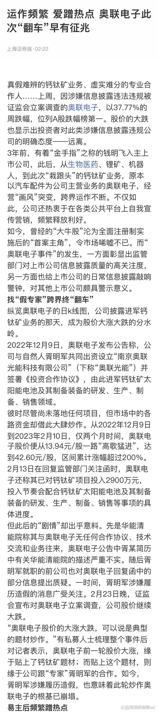 奥联电子去年投2千万搞锂矿,今年投3千万搞钙钛矿,还准备投千万搞机器人,它搞得下来吗?不就是为了做市值而蹭热度吗。于是奥联电子被立案调查了,这对股价的影响是不言而喻的,现在它因造假已经是问题股了。