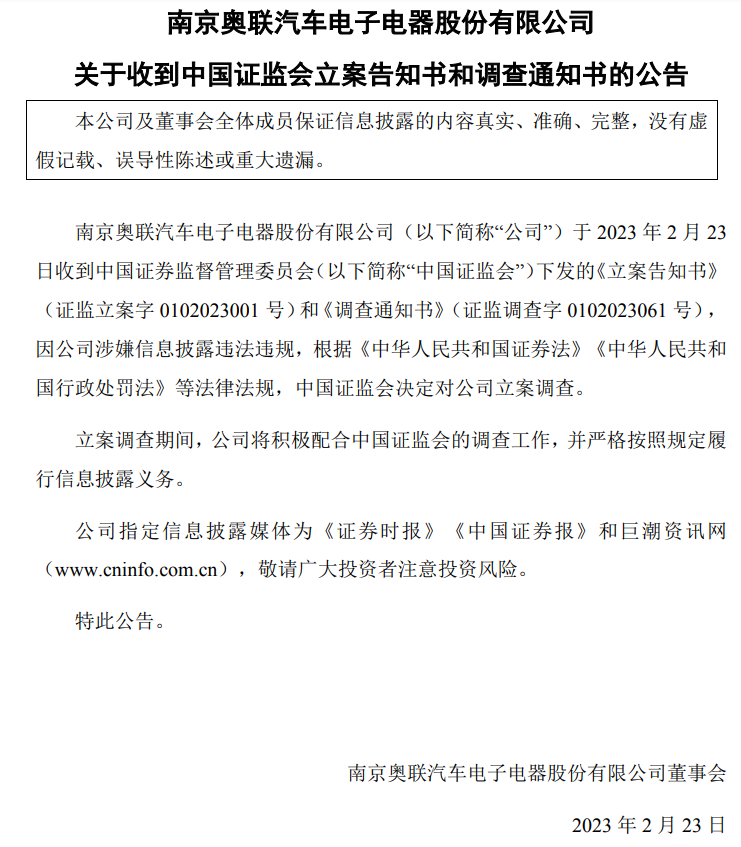 2月25日晚间,奥联电子公告称,因公司涉嫌信息披露违法违规,中国证监会决定对公司立案调查。立案调查期间,公司将积极配合中国证监会的调查工作,并严格按照规定履行信息披露义务。