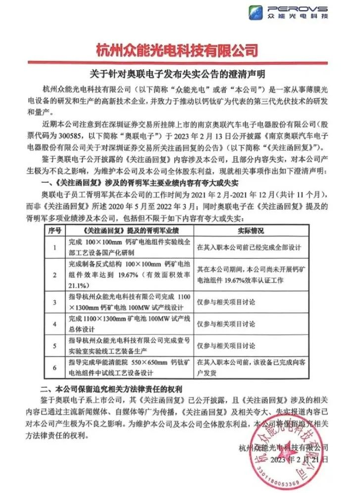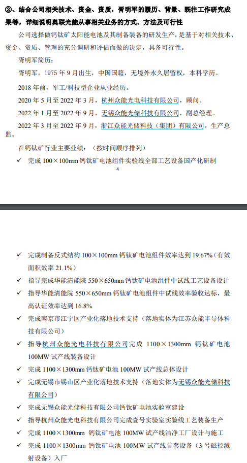 2023年2月13日,奥联电子对上述关注函做了回复。奥联电子公布的关注函回复中披露的胥明军履历显示,胥明军曾先后任职于杭州众能光电科技有限公司、无锡众能光储科技有限公司、浙江众能光储科技(集团)有限公司,指导完成华能清能院550×650mm钙钛矿电池组件中试线工艺设备设计,指导华能清能院550×650mm钙钛矿电池组件中试线效率验收达标、最高认证效率达到16.8%等。