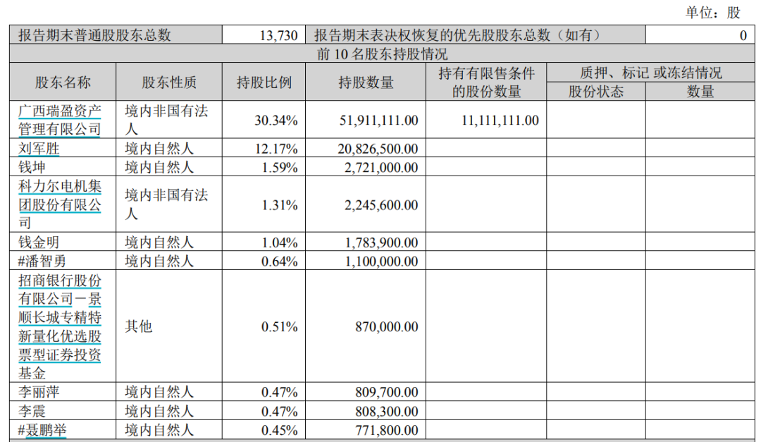 财报显示,2022年三季度末,奥联电子的前十大股东分别为广西瑞盈资产管理有限公司、刘军胜、钱坤、科利尔电机集团股份有限公司、钱金明、潘智勇、招商银行基金、李丽萍、李震、聂鹏举,分别持股30.34%、12.17%、1.59%、1.31%、1.04%、0.64%、0.51%、0.47%、0.47%、0.45%。